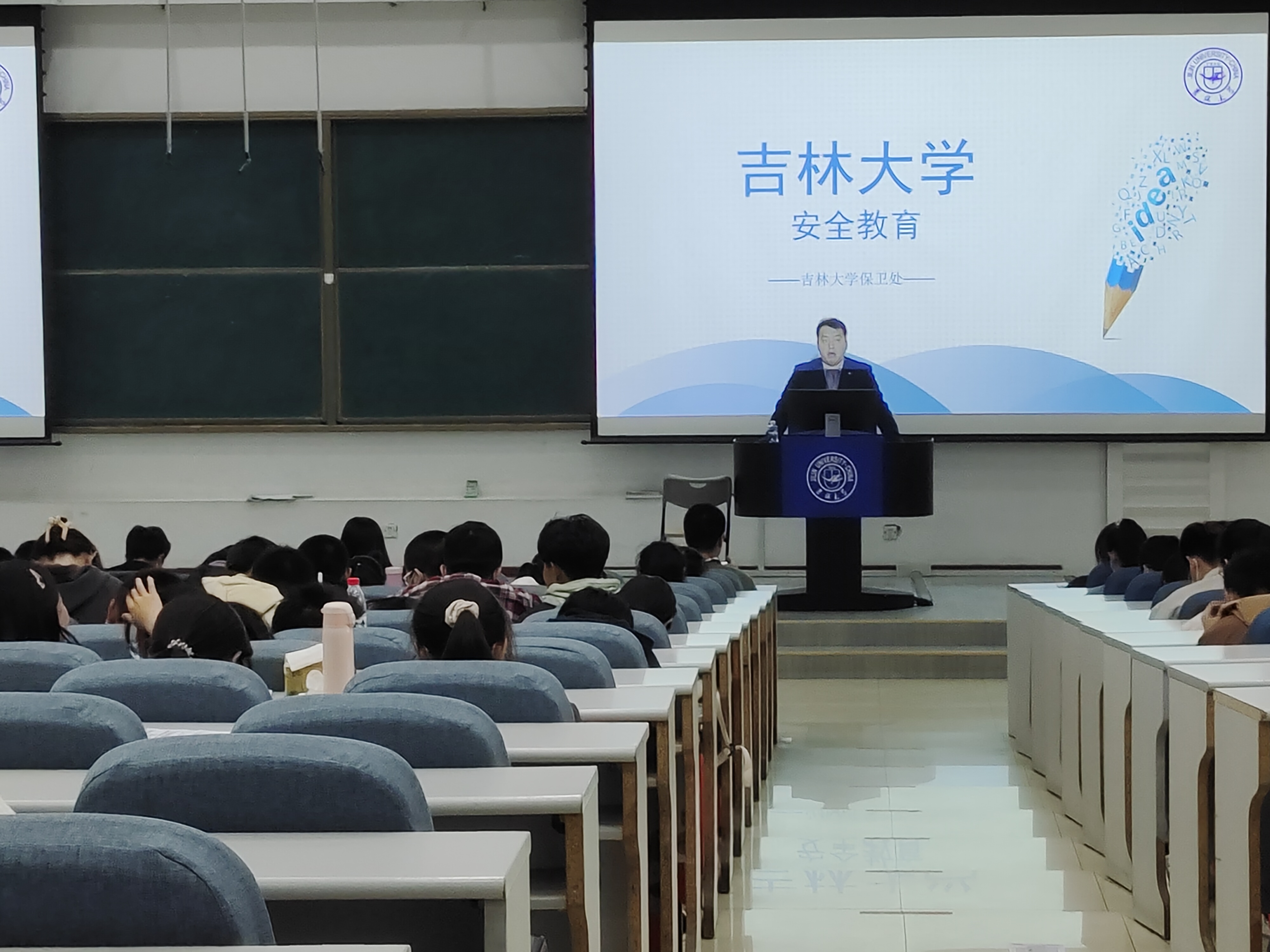 全体2021级本科生于经信教学楼F区5阶教室参加我校保卫处左学成老师的安全教育讲座。